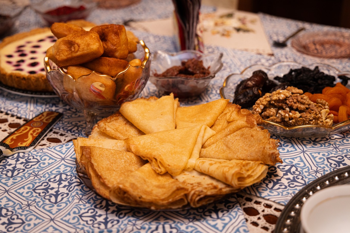 На столе рядом с пышными баурсаками  тоненькие блинчики, пирог из творога и смородины. Глаза разбегаются, что попробовать в первую очередь.