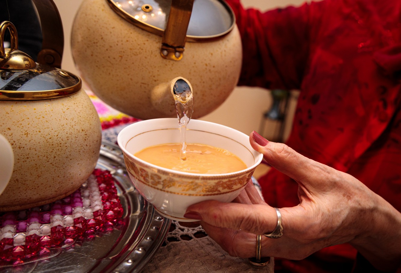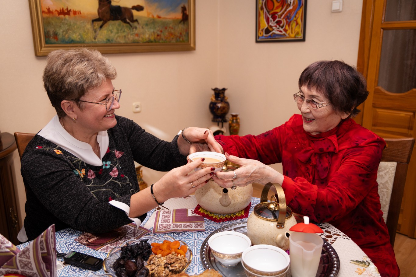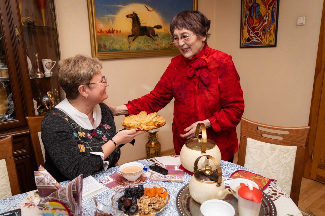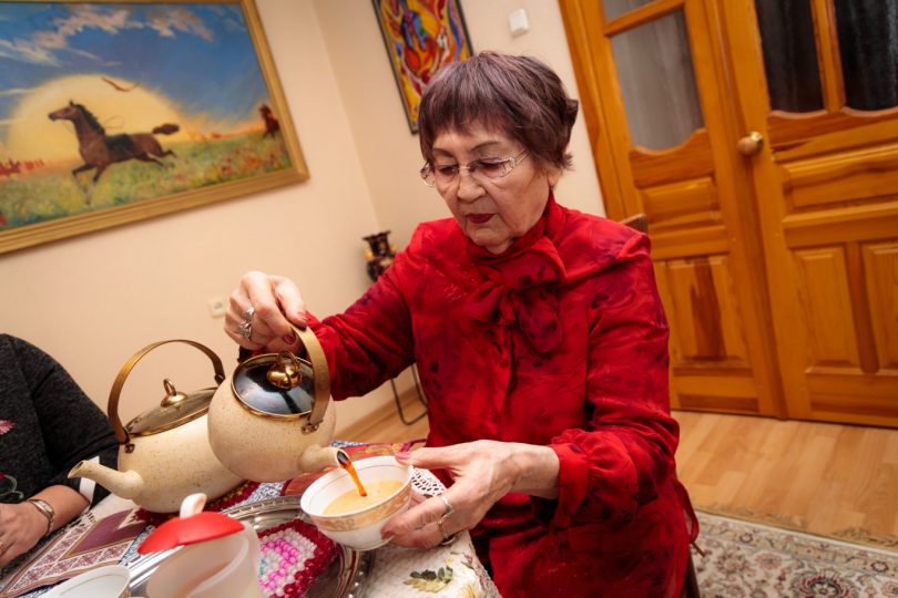 – Я вас угощаю настоящим казахским чаем. Его надо разливать правильно: в небольшие пиалы и передавать двумя руками. Чай должен быть обязательно вкусным, чтобы нас к нему тянуло. Я без него не могу жить. Хорошее у меня настроение или плохое – присаживаюсь у телевизора и пью чай с вареньем. Бодрствую и радуюсь, – улыбается героиня. – Сегодня на правах хозяйки обслуживаю вас я, а в обычный день, когда приходит сноха, она разливает. Молодые женщины должны заботиться о старших.