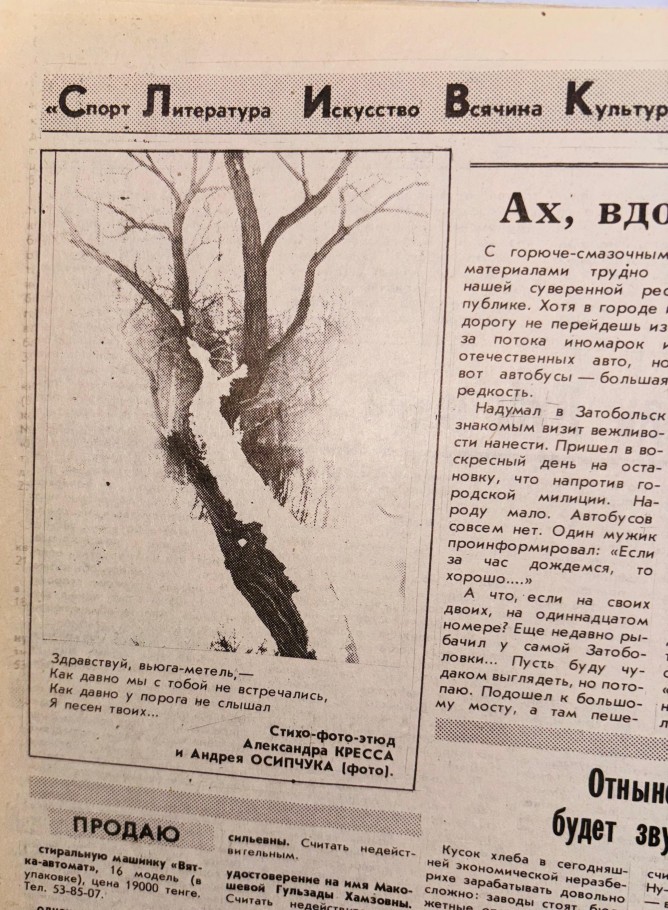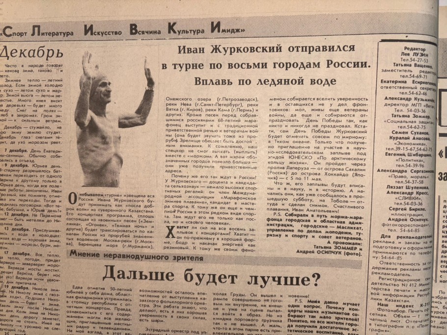 На первой полосе того номера расположилась и более позитивная статья – кустанайский «морж» Иван Журковский позировал в ледяной воде, держа свежий номер газеты «Кустанай». Он отправлялся в необычное турне по восьми городам России вплавь по ледяной воде!