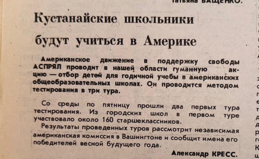 Перелистываем страницу. На информационной полосе видим новость о том, что среди школьников Кустаная проходит отбор на бесплатное годичное обучение в Америке. Отбор проходил в три тура, в первом приняли участие около 160 старшеклассников. Возможность попасть за океан была мечтой, доступной единицам, и в газете того времени сделан на этом акцент.