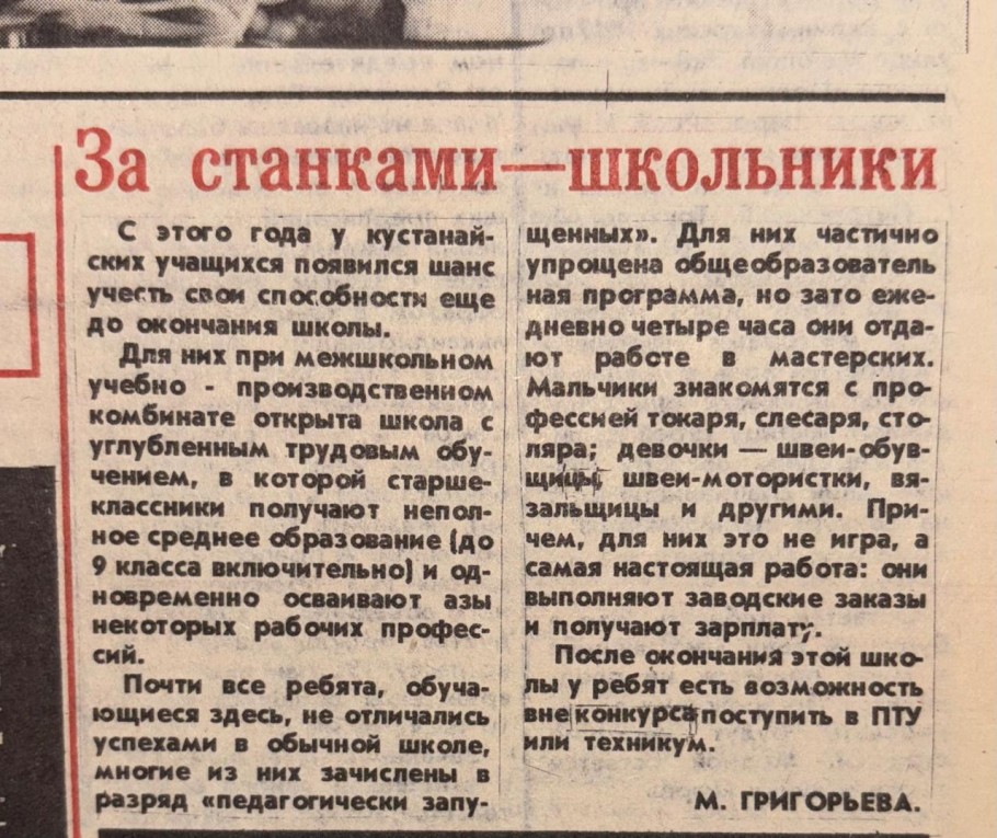 В этом же номере читаем заметку о том, что в Кустанае 35 лет назад при межшкольном учебно-производственном комбинате открылась школа с углубленным трудовым обучением, в которой школьники учатся до 9 класса и получают азы рабочих профессий.