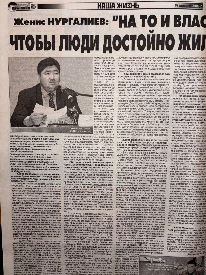Переворачиваем страницу и видим интервью с акимом Костаная, этот пост 19 лет назад занимал Женис Нургалиев (с июня 2006 по январь 2008 года). До апреля 2010 он был заместителем акима Костанайской области, а с 2010 по 2023 – депутатом Сената Парламента РК. Ушел из жизни 16 ноября 2024 года в возрасте 62 лет.