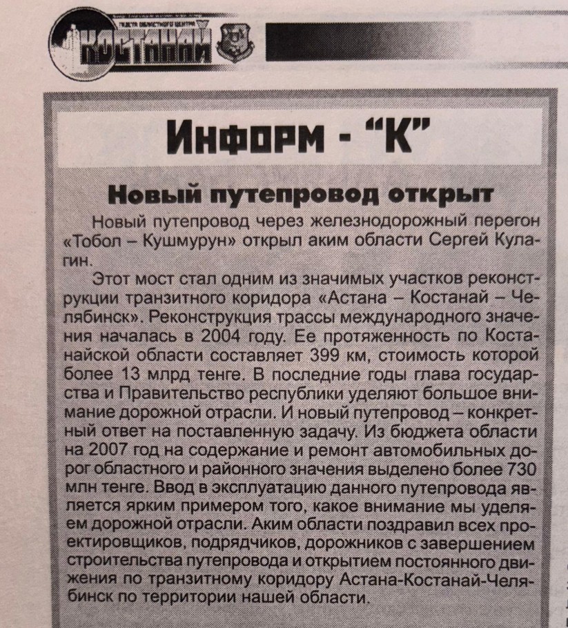 На информационном развороте читаем новость о том, что открылся новый путепровод через железнодорожный перегон «Тобол – Кушмурун». Этот мост стал одним из значимых участков реконструкции транзитного коридора «Астана – Костанай – Челябинск». Реконструкция трассы международного значения началась в 2004 году, стоимость проекта составила более 13 млрд тенге.