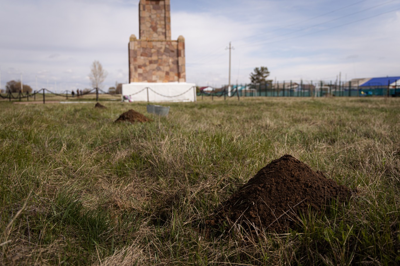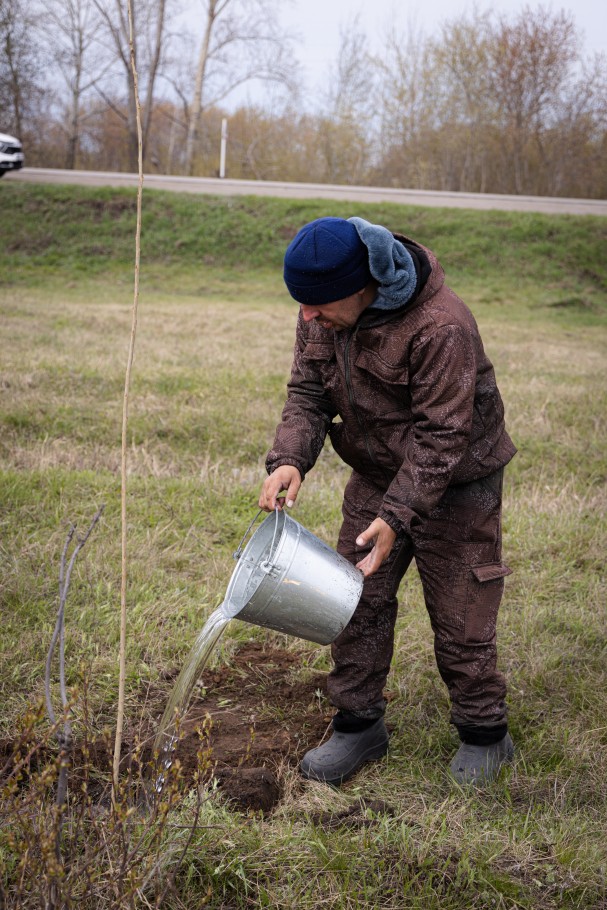 Сельчане и молодые волонтеры работали быстро и слаженно. Одни копали лунки, другие носили воду. К слову, бочку воды специально для посадки деревьев привез местный житель Александр Шепотько. Другие подсыпали в лунки перегной и закапывали саженцы. Через час перед памятником вырос ряд новых деревьев.