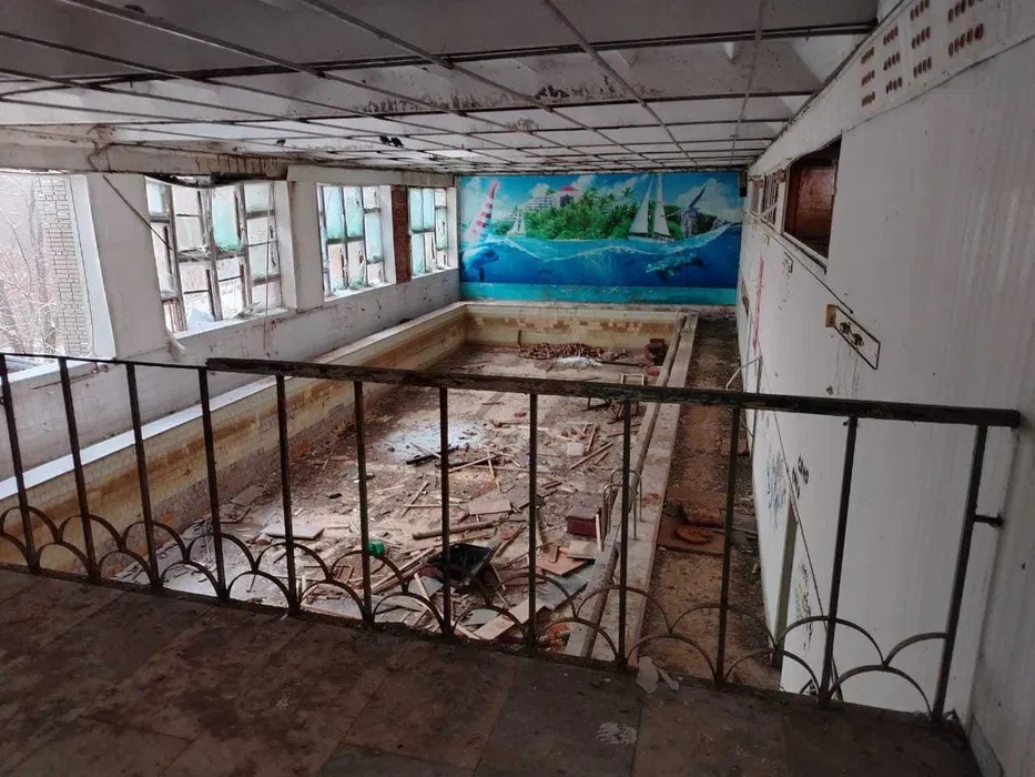 Внутри сохранились чаша бассейна длиной 24 метра, душевые и просторный холл. Второй этаж все еще оборудован под боксерский зал: здесь стоят ринг и шведские стенки. Несмотря на то что объект находится в частной собственности, целевое назначение земли остается прежним — обслуживание спортивного комплекса. Продавец честно признает, что зданию 1984 года постройки требуются серьезные вложения для капитального ремонта. Пока атлеты тренируются в других залах, пустующие стены с тренерскими комнатами и саунами ждут инвестора, готового вдохнуть жизнь в заброшенные дорожки бассейна.