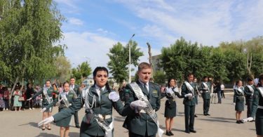 В школе №5 им.Б.Момышулы праздник проходит четко по уставу, со своим гимном и вальсом