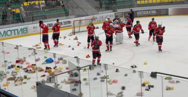 Болельщики бросили на лед сотни игрушек, которые позже передадут в детский дом «Жанұя».