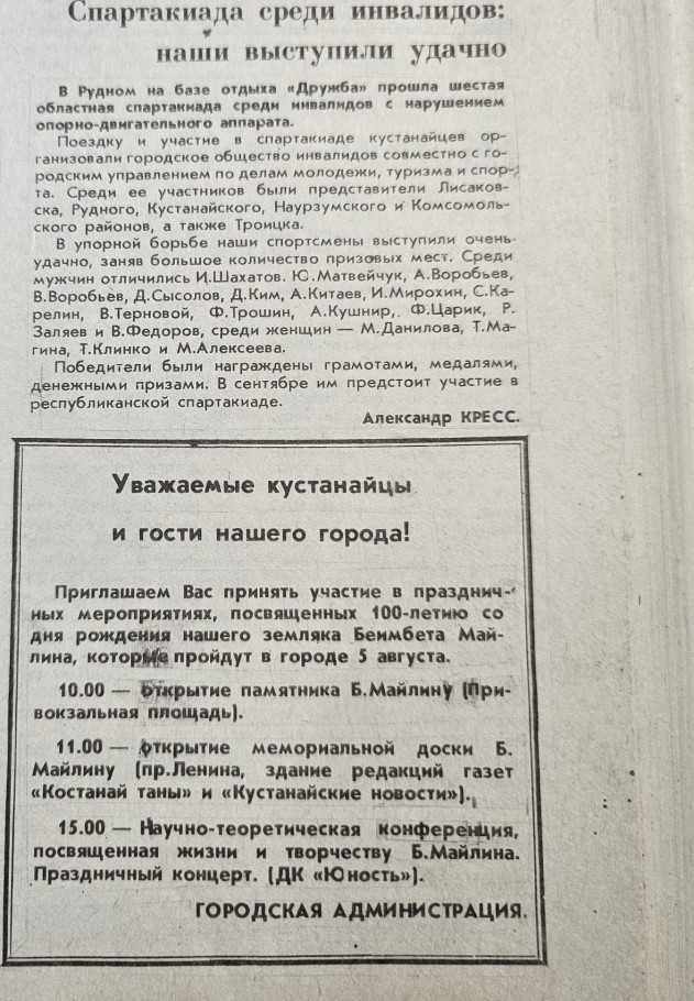 В 1994 году, 5 августа, открывали памятник земляку Беимбету Майлину в честь его 100-летия со дня рождения, а также мемориальную доску на пр. Ленина (ныне — Аль-Фараби). По этому же поводу проводили конференцию и концерт в ДК «Юность» (в 2025-м известный как «Мирас»).
