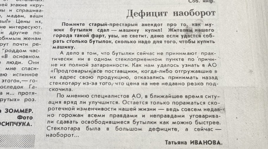 О скоротечной изменчивости жизни задумывались специалисты АО «Продтовары». В тот период почти все местные стеклоприёмные пункты прекратили приём бутылок — цена на них резко поднялась.