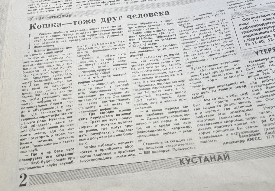 Фелинологический клуб создавался тогда в Кустанае на базе Кустанайского клуба служебного собаководства ДОСААФ. Его председателем являлась Лариса Филимонова. Также отмечалось, что планировалось сделать это «под эгидой Московского фелинологического центра».