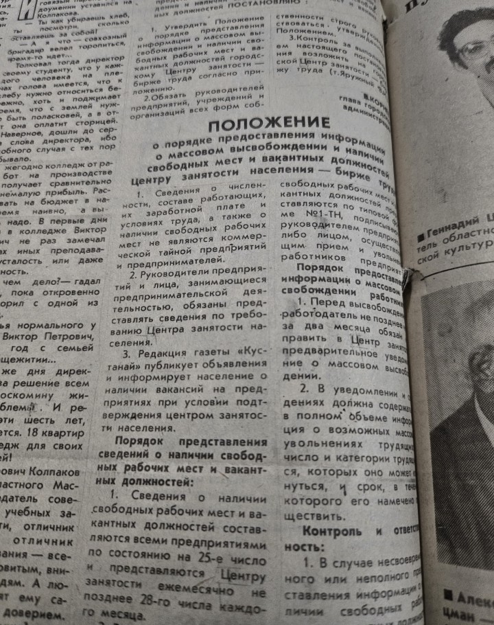 Вышло постановление «Об утверждении Положения о порядке предоставления информации о массовом высвобождении и наличии свободных рабочих мест и вакантных должностей городскому центру». Это было сделано с целью усиления контроля и повышения ответственности руководителей учреждений и организаций всех форм собственности. К примеру, сведения о численности, составе работающих, их заработной плате и условиях труда необходимо было предоставлять Центру занятости населения — бирже труда.