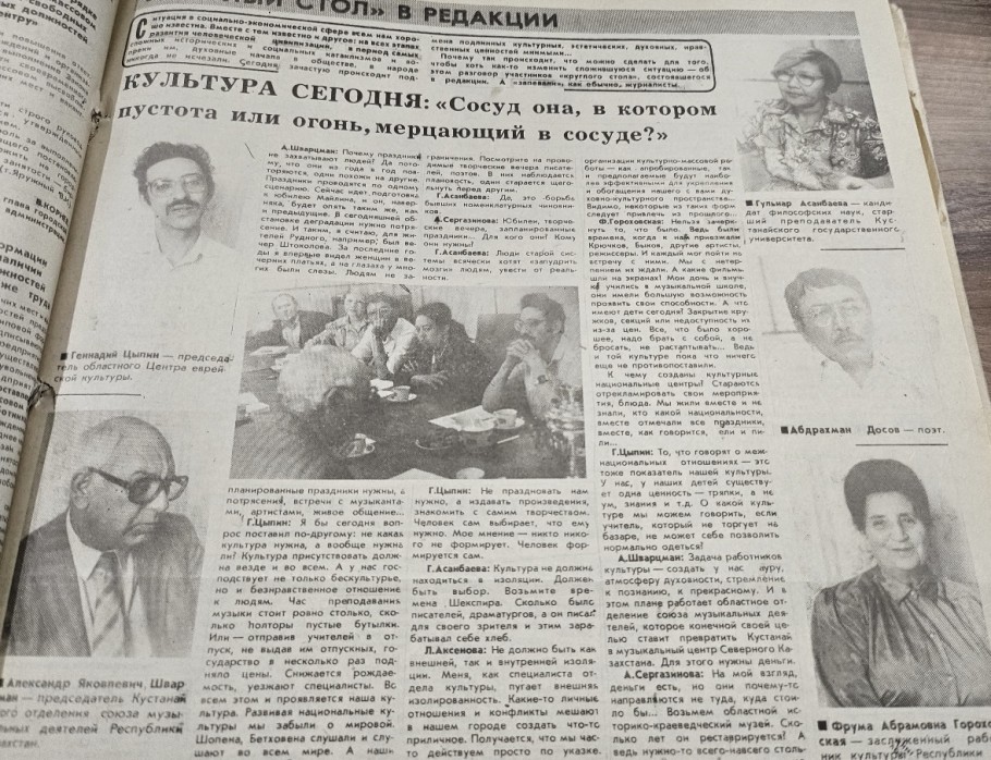Дискуссию в формате круглого стола провели журналисты газеты «Кустанай». Тема беседы касалась социально-экономической сферы — необходимости культуры. Её участниками стали председатель областного Центра еврейской культуры Геннадий Цыпин, председатель Кустанайского отделения Союза музыкальных деятелей РК Александр Шварцман, заведующая отделом областного историко-краеведческого музея Вера Чиченкова, кандидат философских наук и старший преподаватель КГУ Гульнар Асанбаева, поэт Абдрахман Досов и заслуженный работник культуры РК Фрума Гороховская.