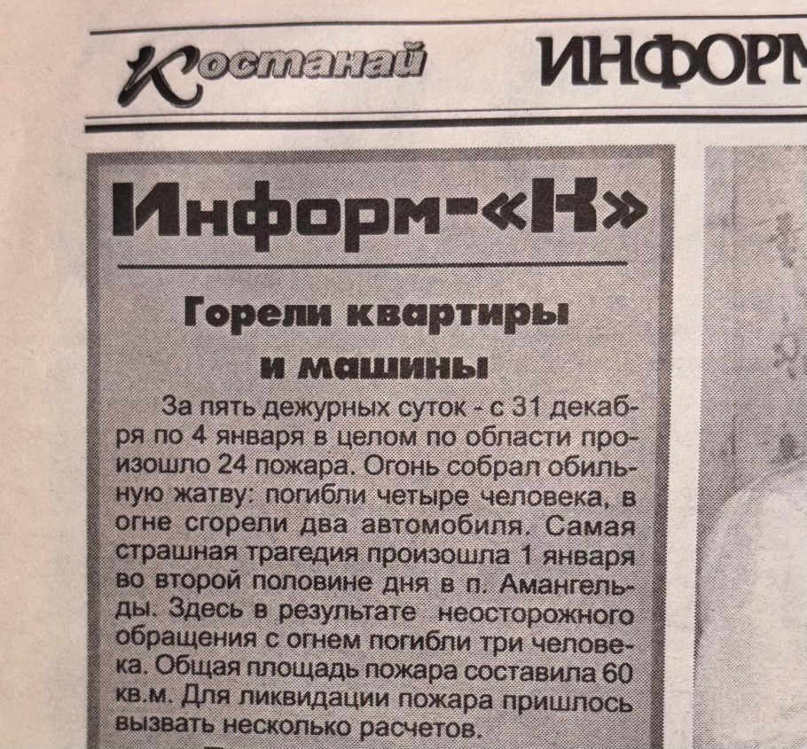 За праздничную неделю – с 31 декабря 2005 года по 4 января 2006 года – в Костанайской области произошло 24 пожара. Самая страшная трагедия произошла в п. Амангельды: погибли трое человек.