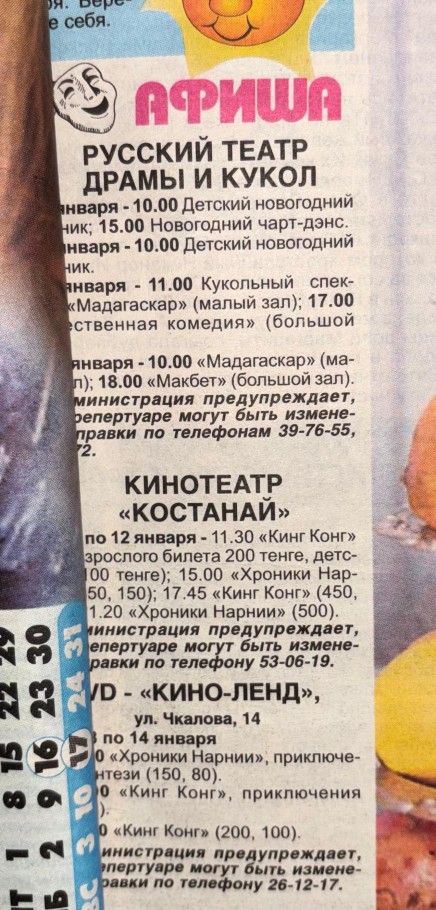 В киноафише также видим, что в кинотеатре «Костанай» тогда показывали уже культовые на сегодняшний день, а тогда новые кинопремьеры – «Хроники Нарнии» и «Кинг-Конг». Стоимость билетов на киносеансы начиналась от 200 тенге.
