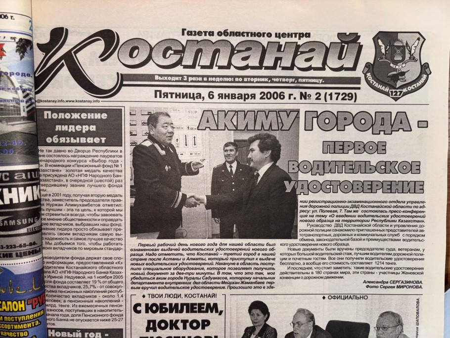 В номере газеты «Костанай» за 6 января 2006 года сообщалось о том, что аким города Нуралы Садуакасов стал первым обладателем водительского удостоверения нового образца. 20 лет назад аппарат, который выпускал документ всего за пару минут, имелся лишь в трех городах Казахстана – Астане, Алматы и Костанае.