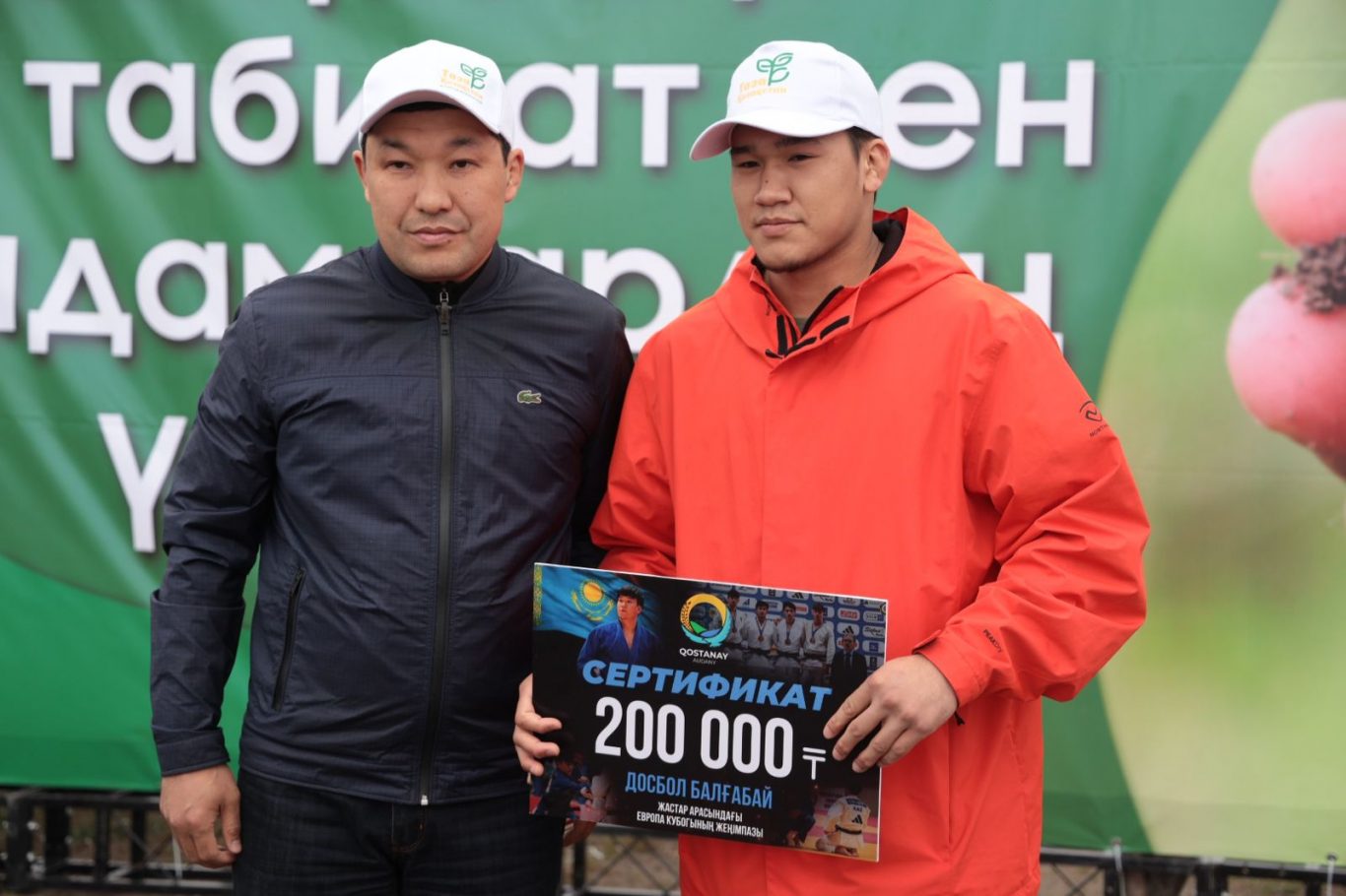 Субботник символично поддержал спортсмен — победитель Кубка Европы по дзюдо Досбол Балгабай, недавно вернувшийся из Италии. Такие примеры особенно важны для молодежи. Спортсмену из рук акима вручили сертификат на 200 000 тенге за одержанную победу.
