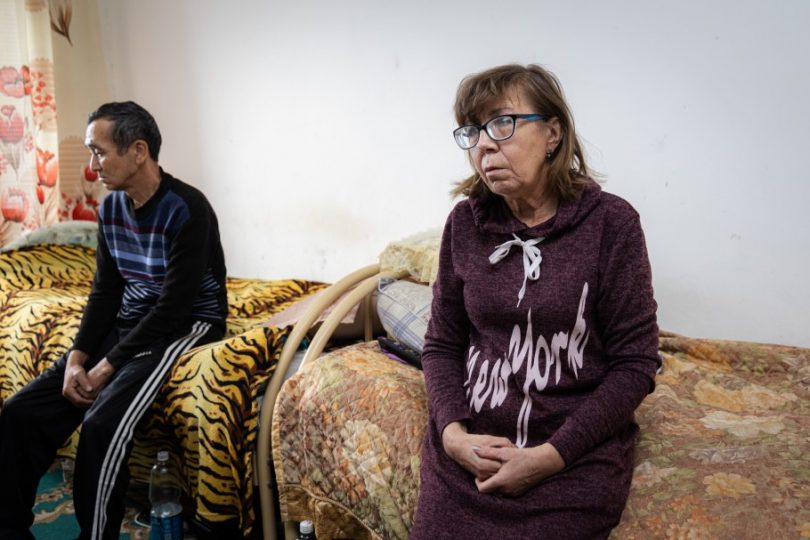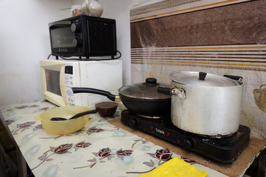 В комнате общежития нас любезно встретила Мария Станиславовна и ее супруг Марат, который приходит навещать семью. Мужчина в прошлом едва не лишился пальцев рук из-за обморожения.