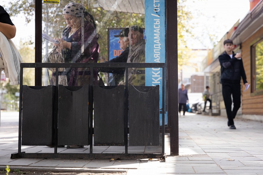 На остановке ТРЦ Kostanay Plaza (по направлению «Алтын Армана») баки теперь тоже одноцветные.