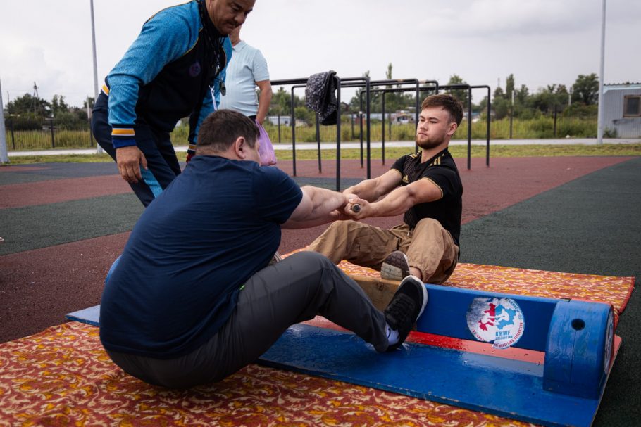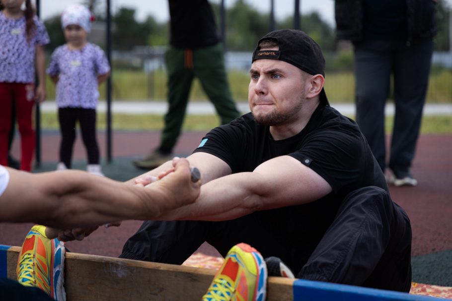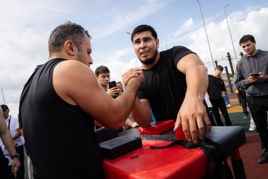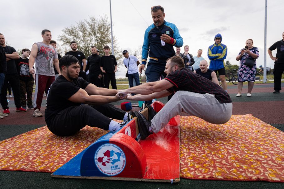 По соседству со скейт-площадкой кипели нешуточные страсти в дисциплине таяқ тарту (перетягивание палки — прим. ред.). Смысл простой: два участника садятся напротив друг друга, упираются ногами в доску, которая разделяет их, и по сигналу судьи тянут палку. У кого получилось вырвать палку или перетянуть оппонента на свою сторону, тот и победил.