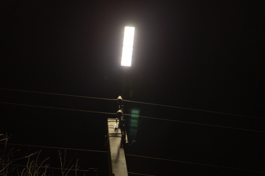 Въезд в жилой массив освещен полностью, даже на панораме были видны ровненькие ряды желтых огоньков. На всей территории, которую мы объехали этим вечером, насчитали только 9 неработающих светильников: два на улице Садовой, не доезжая до перекрестка с улицей Молодежной, и еще два вдоль самой улицы. Три негорящих светильника мы заметили и в районе детского сада и Дружбинской школы. Еще два темных пятнышка – в проулке в одном из кварталов и один на выезде, напротив супермаркета «Светофор».