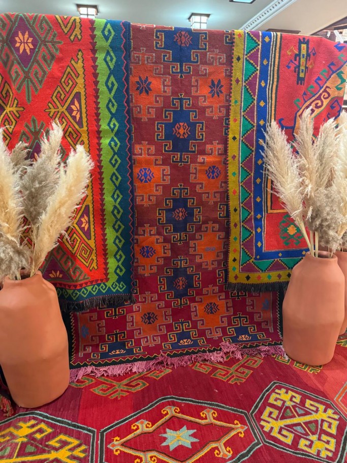 Местные мастера представили экспозицию с национальными украшениями, изделиями из кожи и дерева. Большое внимание участников форума привлекли ковры, сотканные руками костанайских ремесленников.