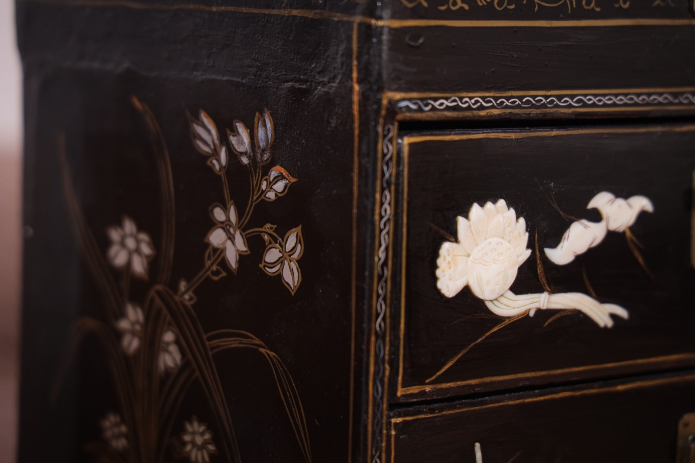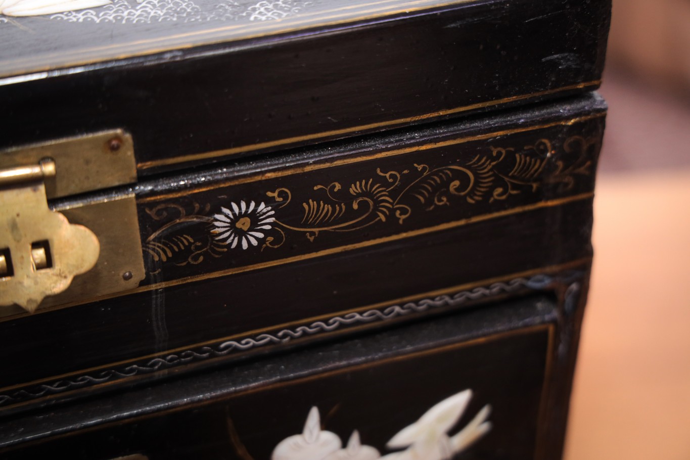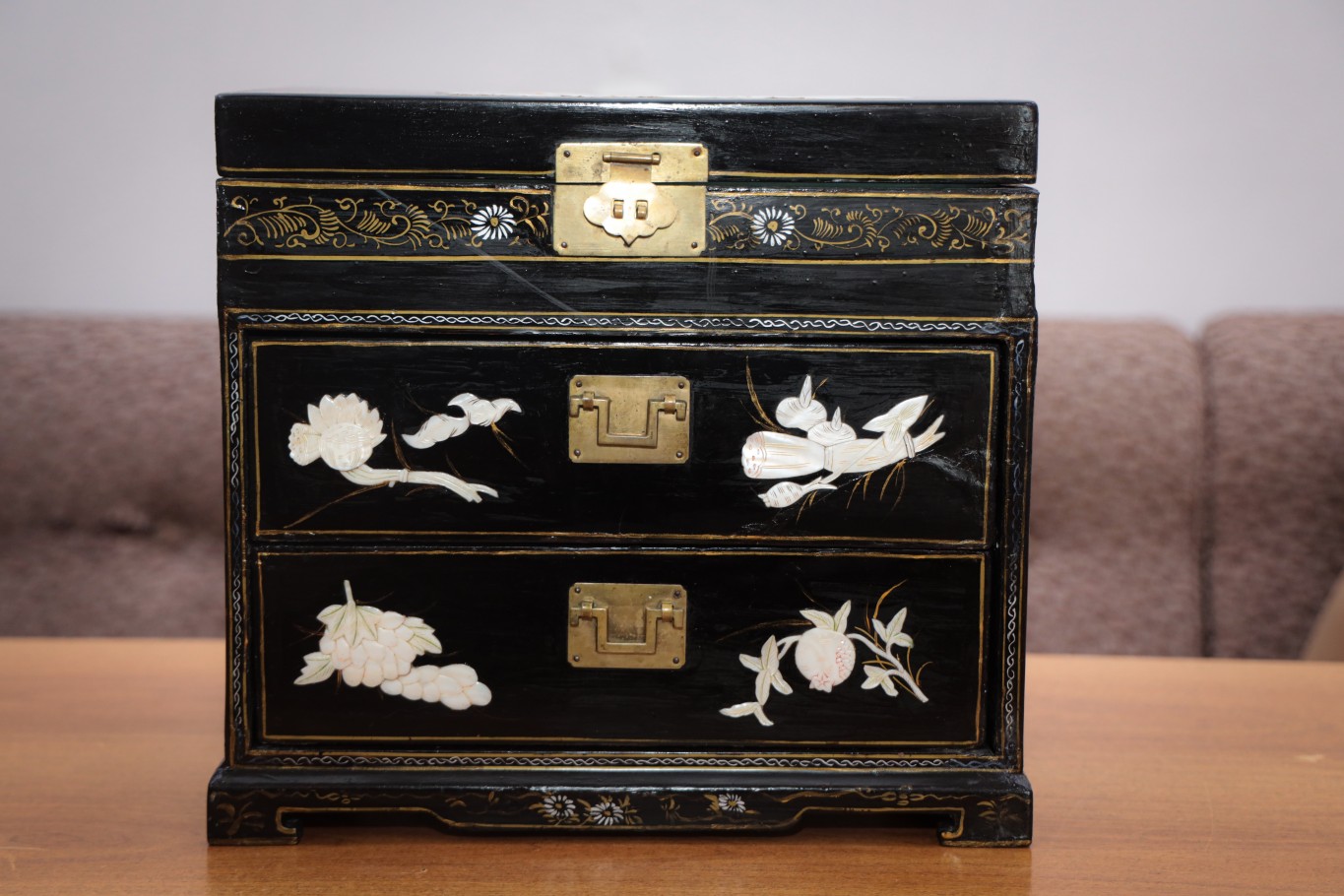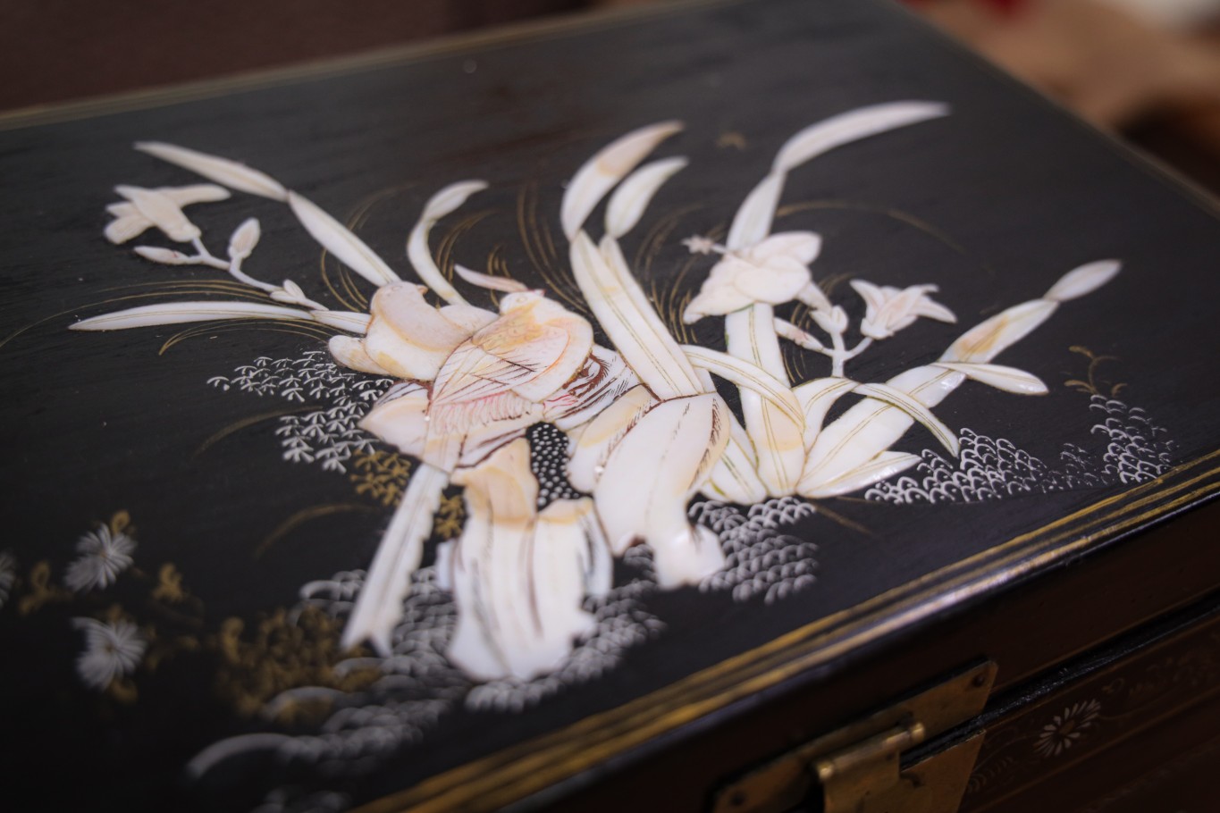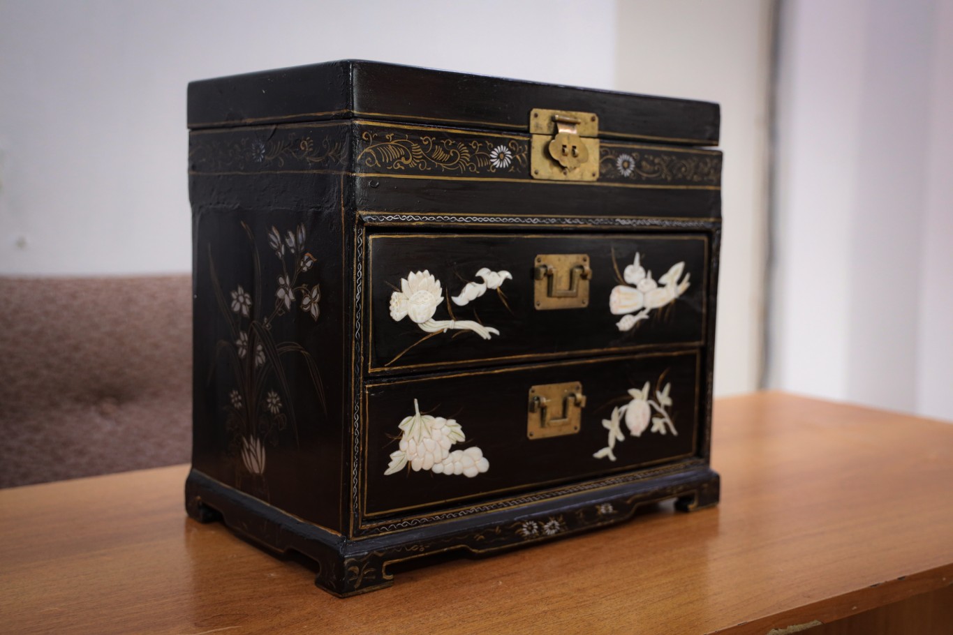 Она выполнена в классическом восточном стиле: прямоугольная, черного цвета, с откидной крышкой и двумя выдвижными ящиками. Поверхность покрыта лаком. Если рассматривать шкатулку внимательно, можно заметить, как тонко выполнены детали: перламутровые вставки словно впаяны в поверхность лака, а узоры выглядят почти живыми. При разном освещении они меняют оттенок от молочно-белого до мягкого розоватого перелива. Это придает предмету особую глубину и ощущение ручной работы.