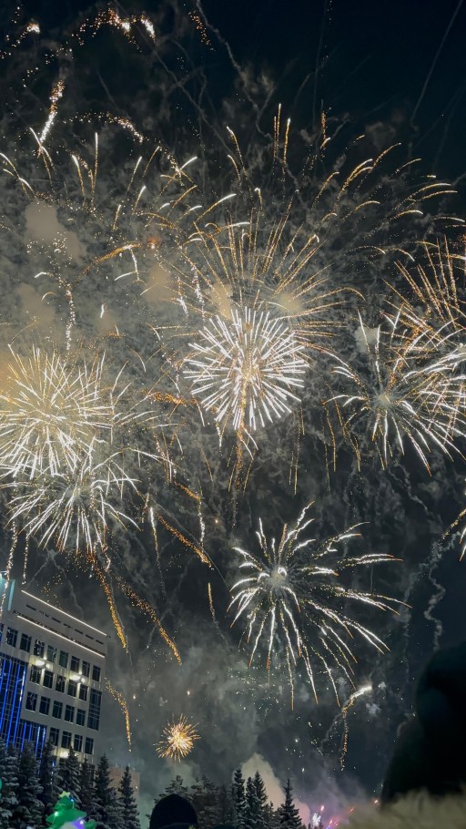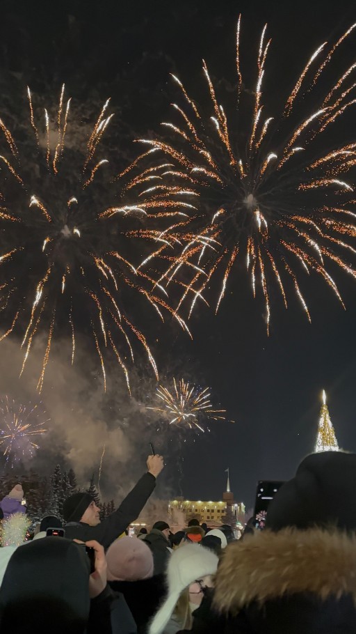 Ровно в полночь над площадью вспыхнули огни праздничного салюта. Фейерверк продолжался около пяти минут и стал кульминацией новогодней ночи. Под залпы салюта горожане аплодировали, обнимались, снимали происходящее на телефоны и загадывали желания.