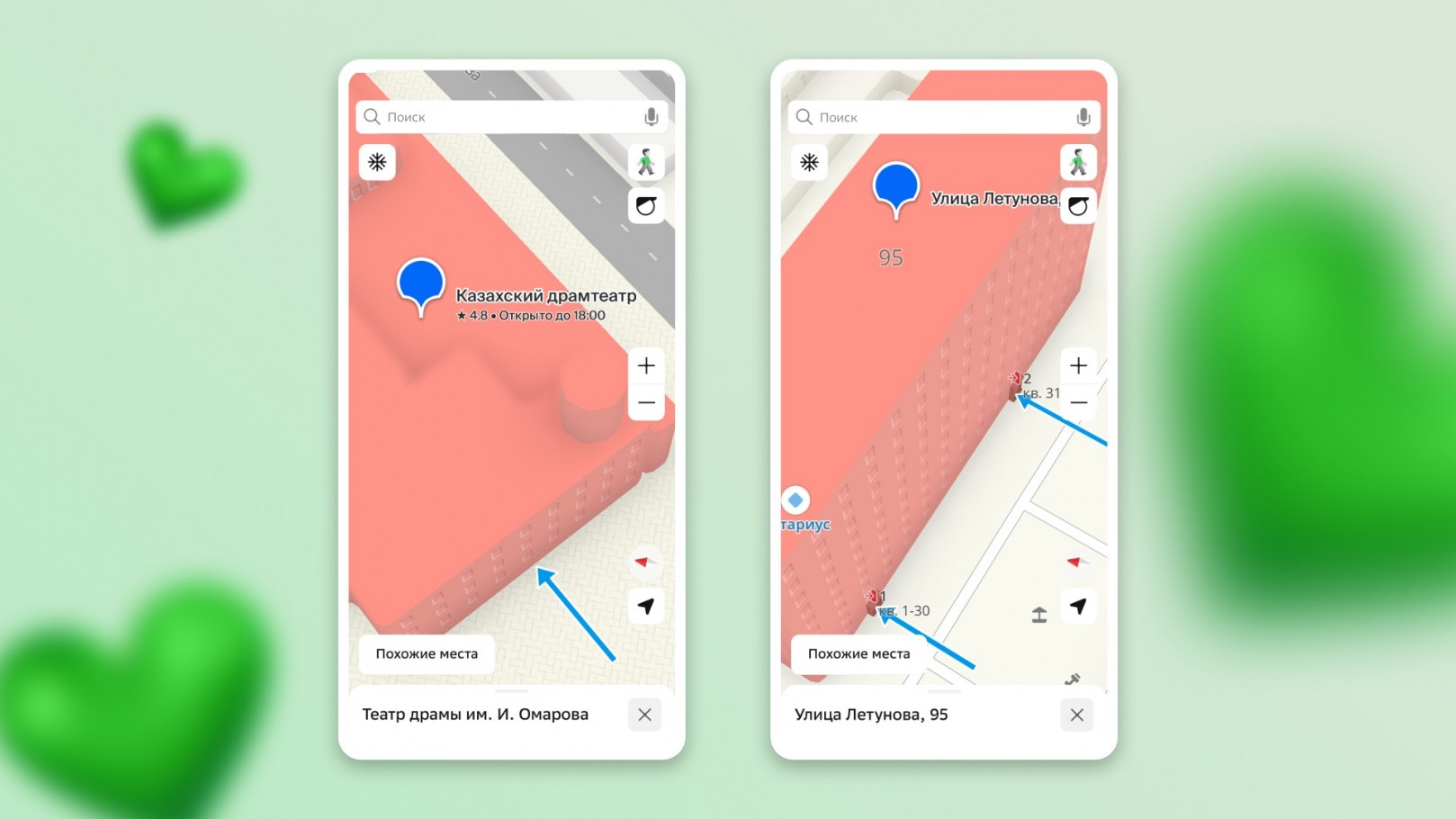 Также карта покажет все доступные входы и подъезды: например, какой вход относится к нужной организации или в каком подъезде нужная квартира. Это пригодится в больших жилых комплексах, бизнес-центрах и ТРЦ, где один адрес может включать несколько входов. Если у вас есть точный адрес с номером квартиры, введите его в 2ГИС — карта сразу покажет нужный подъезд или здание.