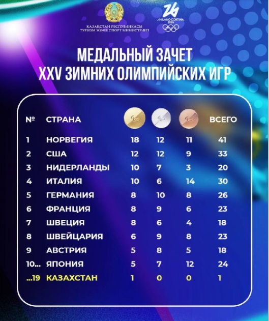 На XXV зимних Олимпийских играх в Италии сборная Казахстана завоевала одну золотую медаль и заняла 19-е место среди 94 стран мира в общекомандном зачете.