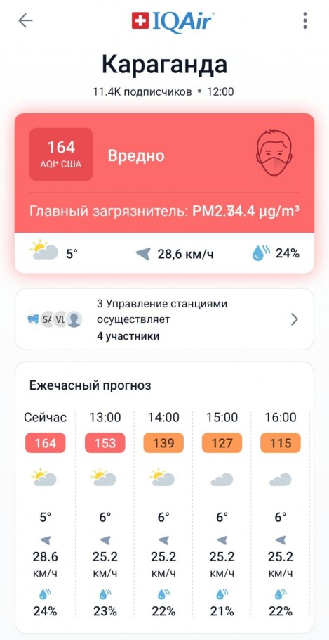 В Караганде к вечеру качество воздуха улучшилось — зона стала зеленой. Однако в момент просмотра страницы уровень загрязнения был отмечен красным — «вредно» (164).