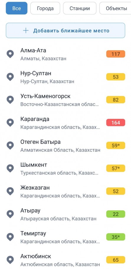 Источником данных указана Национальная гидрометеорологическая служба Казахстана. От Республики Казахстан она предоставляет данные с 18 станций. Например, в Алматы — четыре станции в разных частях города, где показатели AQI составляют: 79, 66, 85 (все — желтого цвета, то есть средний уровень загрязнения) и 16 (зеленый — на ледовой арене).