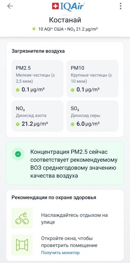 PM2.5 — это мелкие твердые частицы в воздухе. Они представляют серьезную угрозу здоровью при высоких концентрациях, так как при дыхании проникают в кровоток. В Костанае их сейчас нет.