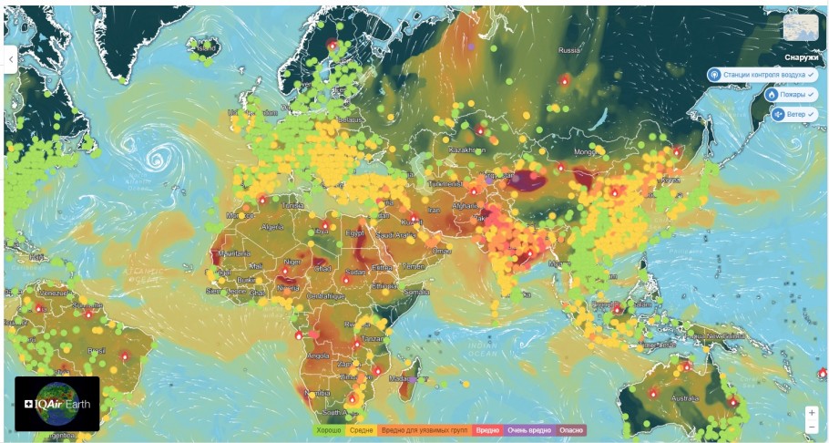 С помощью анимированной 3D-карты загрязнения воздуха в реальном времени и интерактивной карты качества воздуха можно увидеть, в какой цветовой зоне находится та или иная область, где зафиксированы пожары, в каком направлении дуют ветры и где расположены станции контроля качества воздуха.