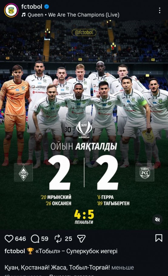 Во второй половине игра была напряженная, произведен ряд замен, вышел Дастан Сатпаев, а на 89-й Асхат Тагыберген со штрафного выровнял положение и перевел всё в серию пенальти, где сильнее оказался «Тобол».