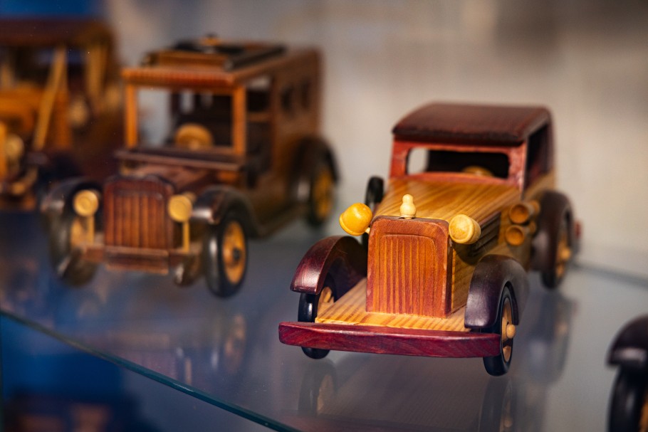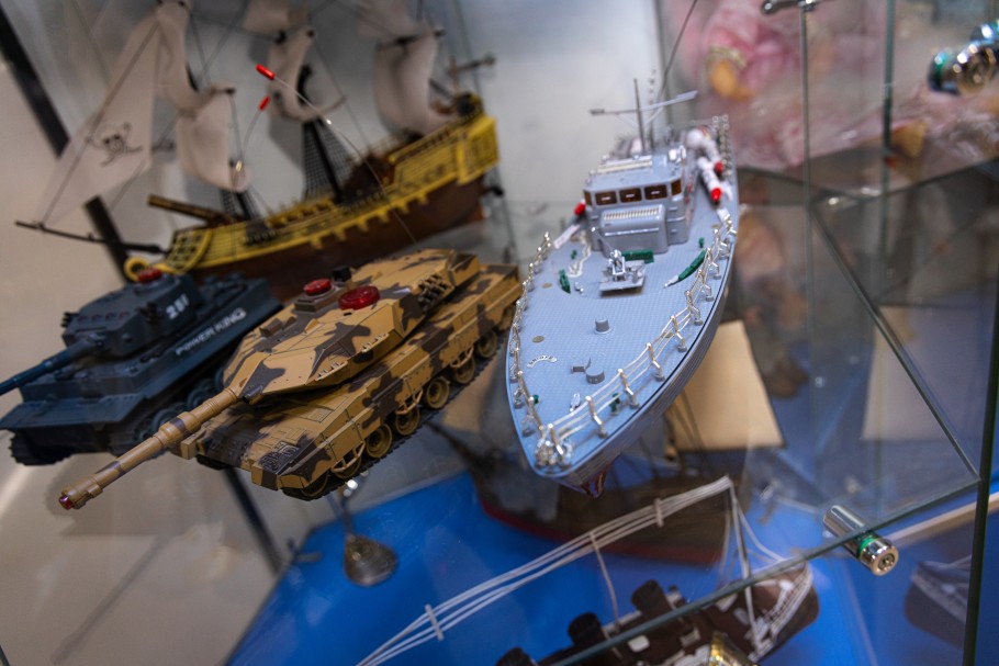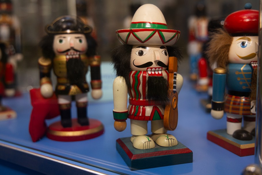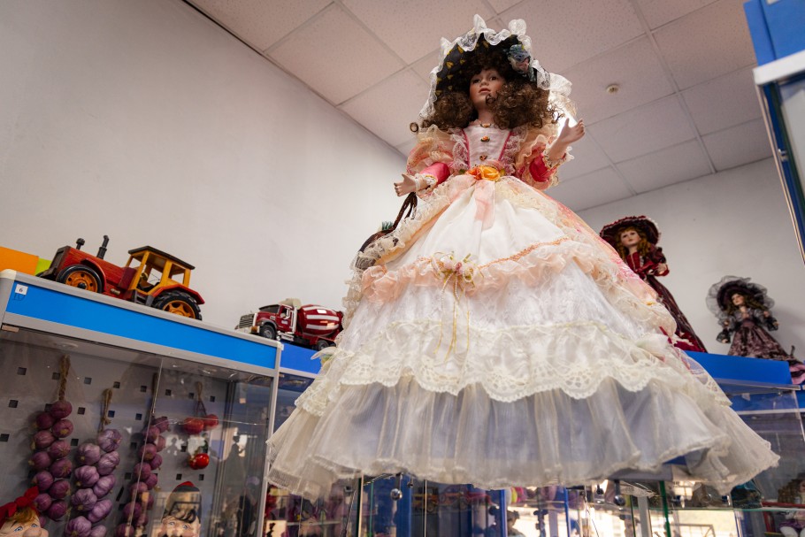 На полках игрушки разных эпох и народов: фарфоровые куклы в бальных платьях, трансформеры из оригинальной серии, музыкальные шкатулки, целая коллекция Щелкунчиков, металлические машинки, советские неваляшки, редкие коллекционные фигурки, модели самолетов и даже домик Барби.