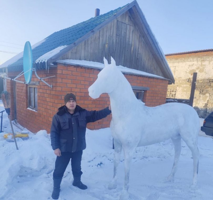 В этом году мужчина решил создать лошадь и собаку – снежные, но настолько реалистичные, что невольно замедляешь шаг.