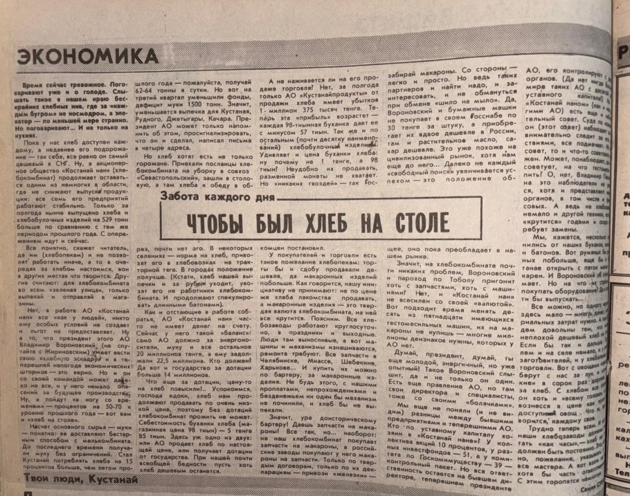 В продолжении статьи на 4-й полосе газеты сказано, что себестоимость буханки хлеба составляла 5 тенге 85 тиын, а продавали её в магазинах по 98 тиын благодаря субсидиям от государства. На сегодняшний день буханка обычного хлеба стоит 192 тенге, а социального — 92.