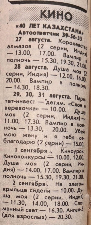 И, наконец, на страницах газеты — киноафиша. Август 1994-го: в кинотеатре «40 лет Казахстана» идут индийские фильмы «Королевство алмазов», «Вампир и полночь», «Душа моя».