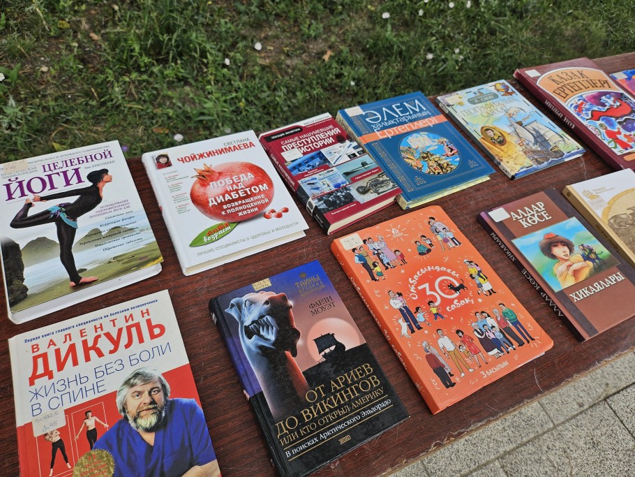 – Социальная акция проводится с июня по август. Мы выходим в массы, к читателю, – поделилась заведующая сектором отдела абонементов Тойбосын Кушекбаева. – Любой может к нам зайти, взять книги — и не только те, что здесь представлены. Среди них можно найти и художественную литературу, и что-то о здоровье, и технику игры в шахматы, и прочее — на казахском и русском языках.