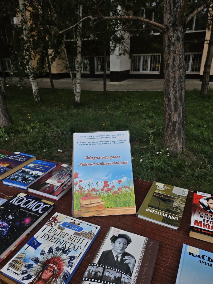 На главном входе в Центральный парк города по будням сотрудники Костанайской областной библиотеки им. Л. Н. Толстого размещают книги