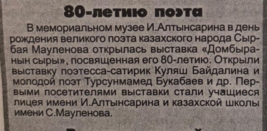 Газета писала и о культурной жизни. В Казахстане отмечали 80-летие поэта Сырбая Мауленова. А сегодня, спустя 23 года, мы чествуем 140-летие Миржакыпа Дулатова. В Костанае в его честь уже открыт памятник и благоустроен сквер.