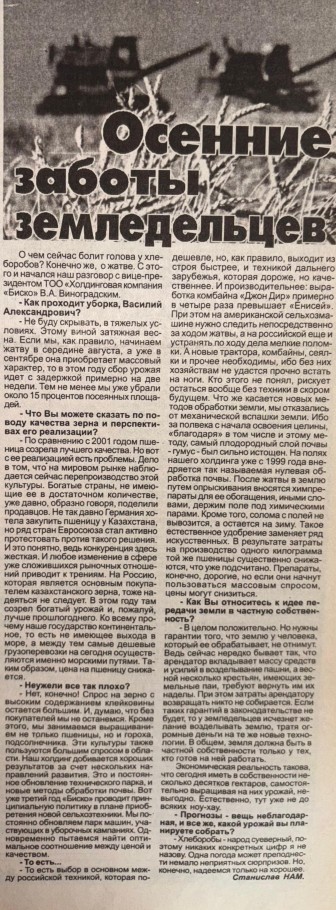 Рядом на полосе разместилось интервью с вице-президентом ТОО «Холдинговая компания „Биско“» Василием Виноградским. Представитель сельскохозяйственной отрасли рассказывал, что уборка шла в непростых условиях — из-за затяжной весны работы по сбору урожая задержались на две недели. 23 года спустя, в 2025 году, аграрии не жалуются на сезон — погода весенне-летнего периода благоприятствует хорошим показателям. На данный момент по зерновым уже убрано почти 1,5 млн гектаров, намолочено 1 млн 977,9 тыс. тонн зерна.