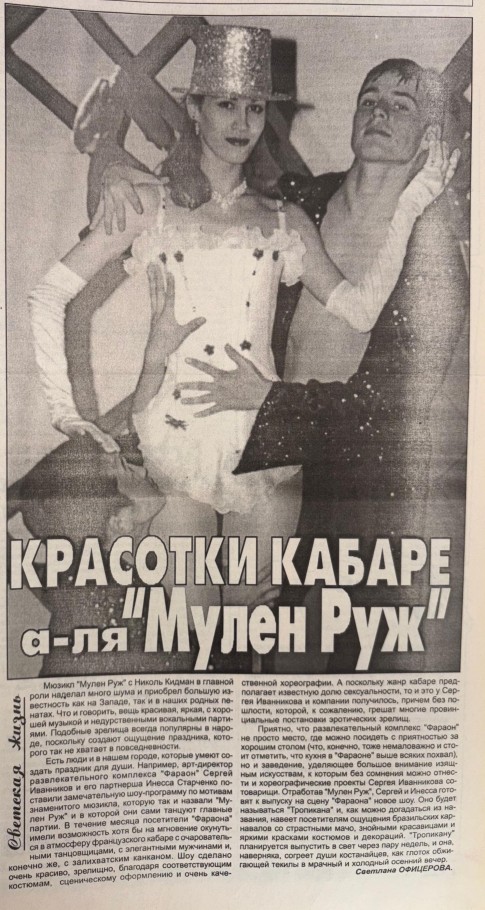 А в разделе «Наш дом» корреспонденты писали о кабаре-шоу в стиле «Мулен Руж», прошедшем в ночном клубе «Фараон». Тогда, на волне популярности одноименного фильма с Николь Кидман, костанайцы тоже смогли окунуться в атмосферу парижских страстей. Постановку подготовил арт-директор клуба Сергей Иванников. Журналисты отмечали, что шоу получилось зрелищным — «без пошлости, которой, к сожалению, грешат многие провинциальные постановки эротических зрелищ».