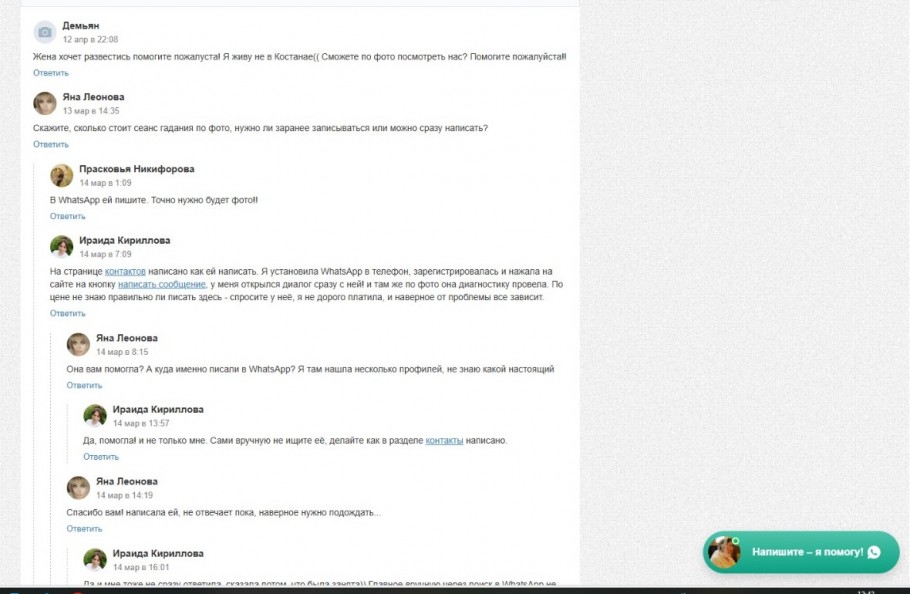 На одной из найденных нами страниц женщина не называет своей фамилии, но есть отдельное окошко – «приворот». Сайт датируется 2020 годом. Есть отзывы, но только положительные. На вопросы посетителей отвечают другие, хозяйка сайта не вступает ни с кем в диалог.
