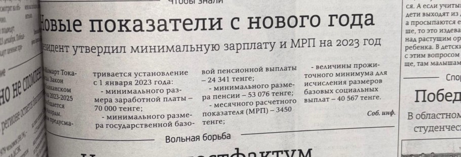 Три года назад журналисты «НК» писали о том, что с 1 января 2023 года минимальная зарплата составит 70 тысяч тенге (на 2025 год – 85 тысяч тенге), минимальная пенсия – 53 076 тенге (на 2025 год – 62 771), МРП – 3 450 (на 2025 – 3 932), прожиточный минимум – 40 567 (на 2025 – 46 228).