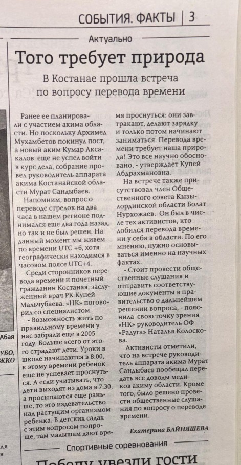 Кроме того, на информационной полосе читаем заметку о том, что в скором времени планируется перевести время на час вперед. В итоге в Казахстане единый пятый (UTC+5) часовой пояс установили спустя полтора года – 1 марта 2024 года.
