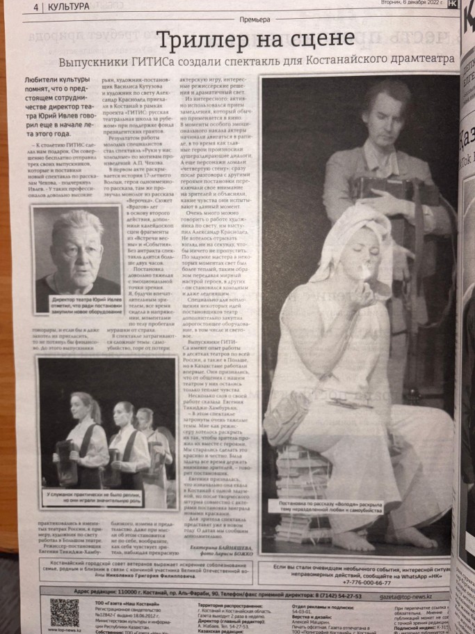 На завершающей, четвертой полосе вторничного номера читаем репортаж с недавней премьеры спектакля «Руки у нас холодные» Костанайского областного русского драмтеатра. Над постановкой работали выпускники московского ГИТИСа. Режиссером выступила Евгения Тикиджи-Хамбурьян, которая в октябре 2024 года стала главным режиссером театра и остается им до сих пор. Вот такое получилось плодотворное сотрудничество.
