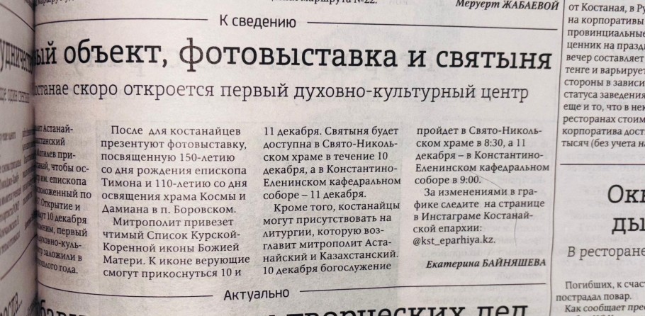 Также на информационном развороте читаем новость о том, что в Костанае готовились к открытию первого духовно-культурного центра Костанайской и Рудненской епархии. Его двери распахнулись 10 декабря 2022 года.