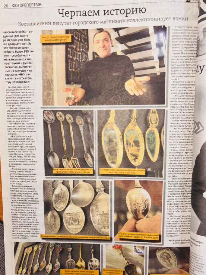 Завершает номер красочный фоторепортаж, посвященный необычному хобби костанайского депутата гормаслихата Виктора Недина – коллекционированию ложек.