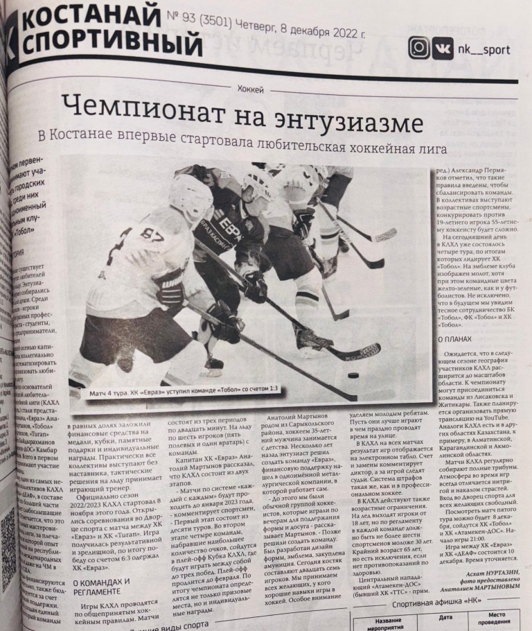 А на полосе «Костанай спортивный» видим новость о том, что стартовала Костанайская любительская хоккейная лига, в рамках которой играют спортсмены-любители. За три года проект превратился в масштабный турнир с несколькими дивизионами: «Любители», «Прогресс», «Мастер» и др. Матчи проходят на Ледовой арене, вход бесплатный, а расписание публикуют в Instagram @klhl_kst.